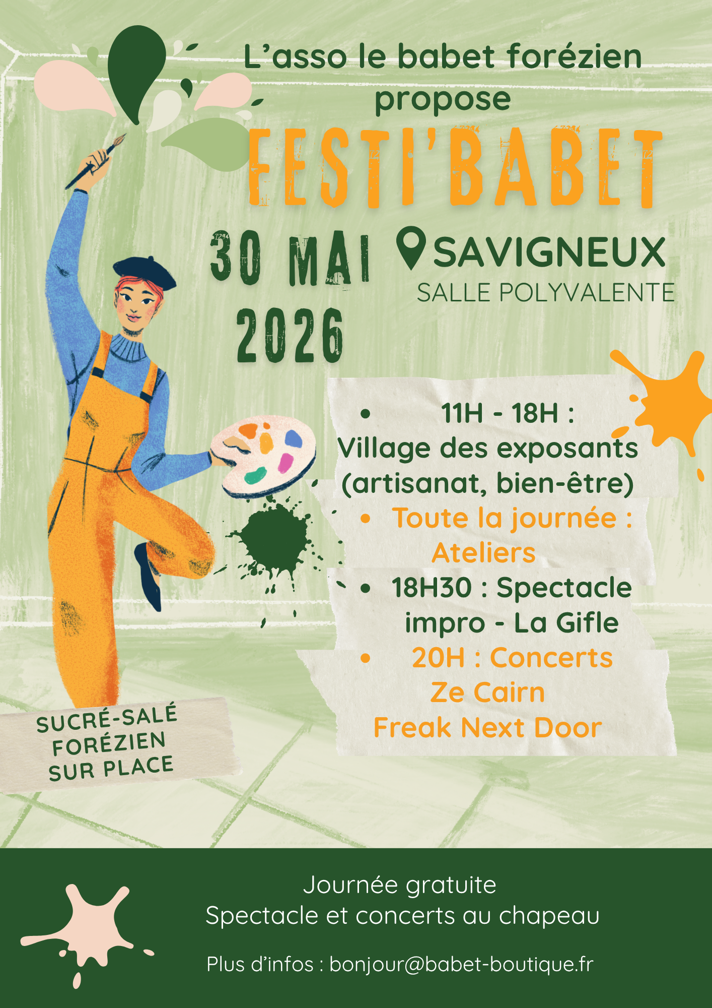 Ambiance conviviale assurée avec un beau programme d'ateliers pour tous les goûts et tous les âges, des exposants (artisanat et bien-être) pour présenter leur savoir et savoir-faire, et une soirée festive avec : - Spectacle d'impro de La Gifle - Concert