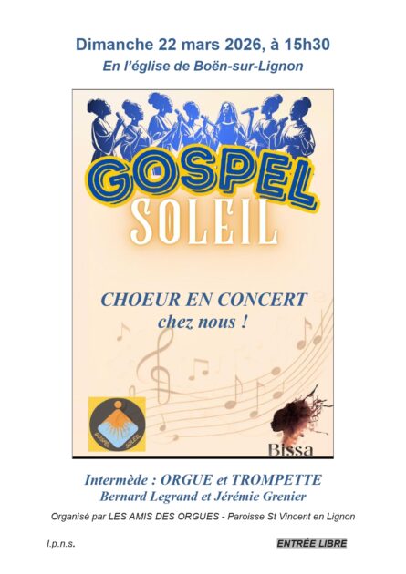 Gospel Soleil en concert avec intermède trompette (Jérémie Grenier) et orgue (Bernard Legrand).