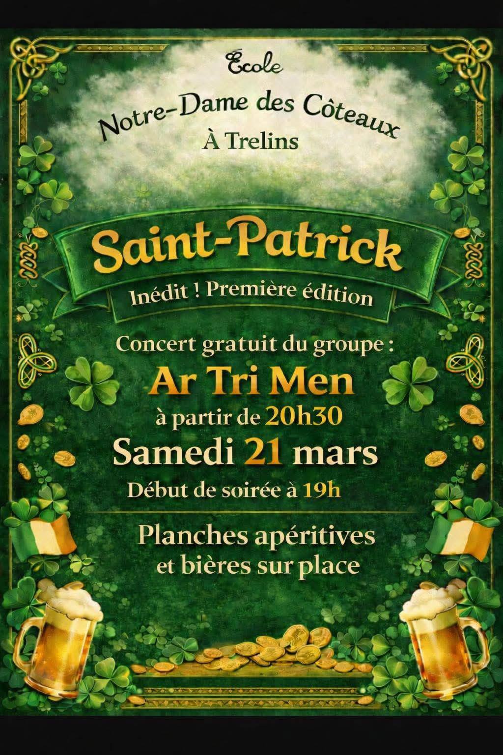 La 1ère édition de la Saint-Patrick à Trelins vous invite à une soirée festive et conviviale avec un concert du groupe Ar Tri Men à 20h30. La soirée débutera dès 19h, offrant l'occasion de se retrouver autour de planches apéritives et de bières sur place