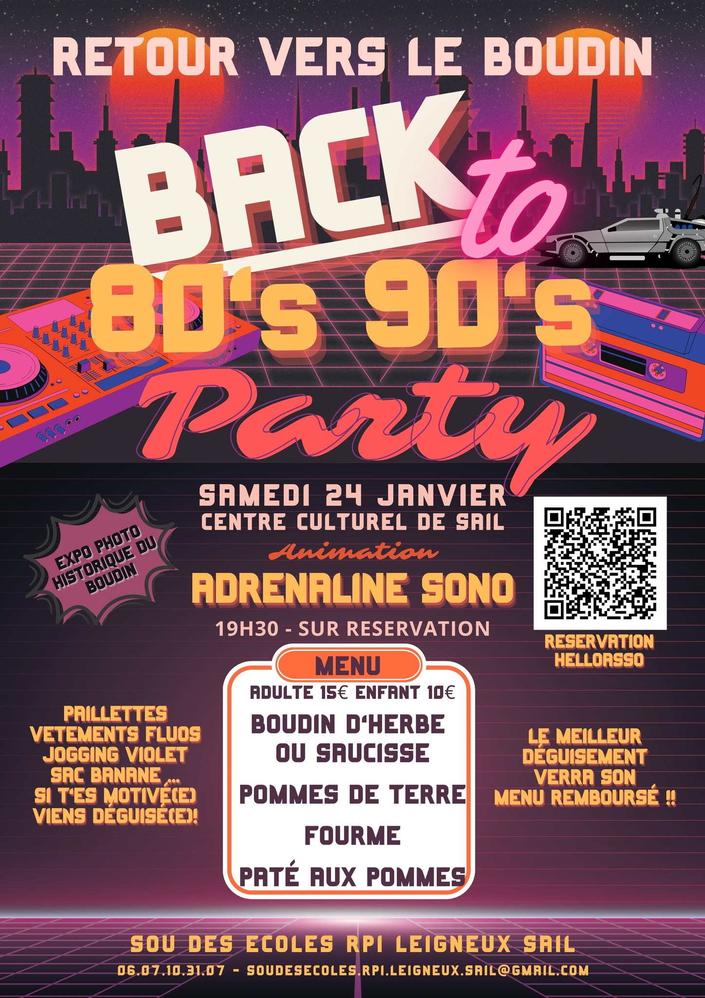 Soirée boudin animée par Adrénaline Sono. Au menu : Boudin d'herbes ou saucisse, pommes de terre, fourme, pâté aux pommes. Le meilleur déguisement verra son menu remboursé : paillettes, vêtements fluos, jogging violet, sac banane....