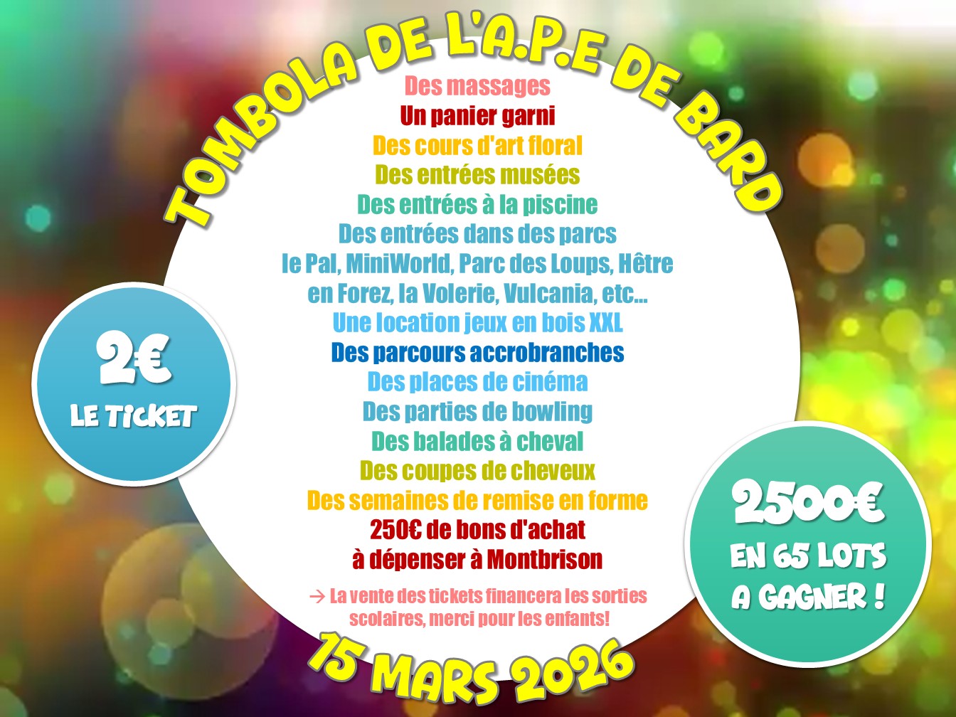 Nous ferons le tirage au sort de la tombola le même jour à 16h à la salle des fêtes, buvette/snack sur place. Nous vous attendons nombreux, il y a + de 2500€ de lots à gagner !